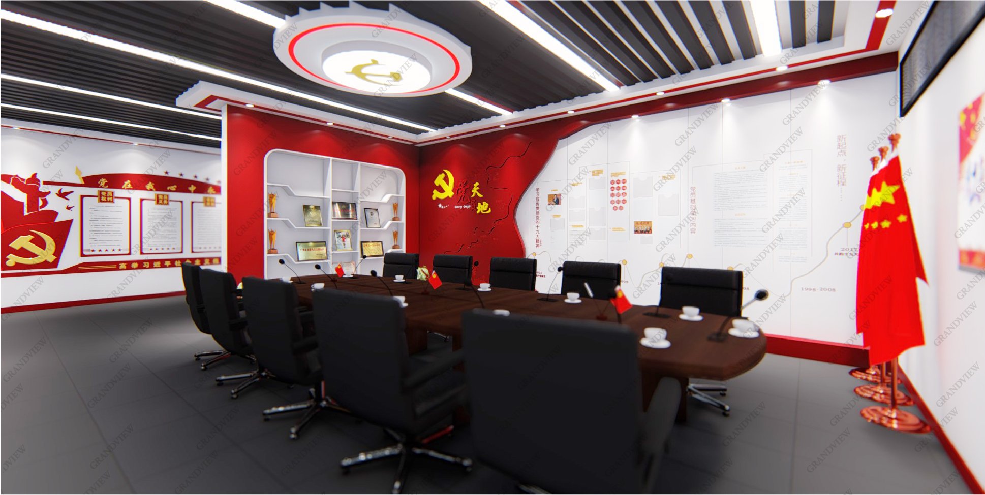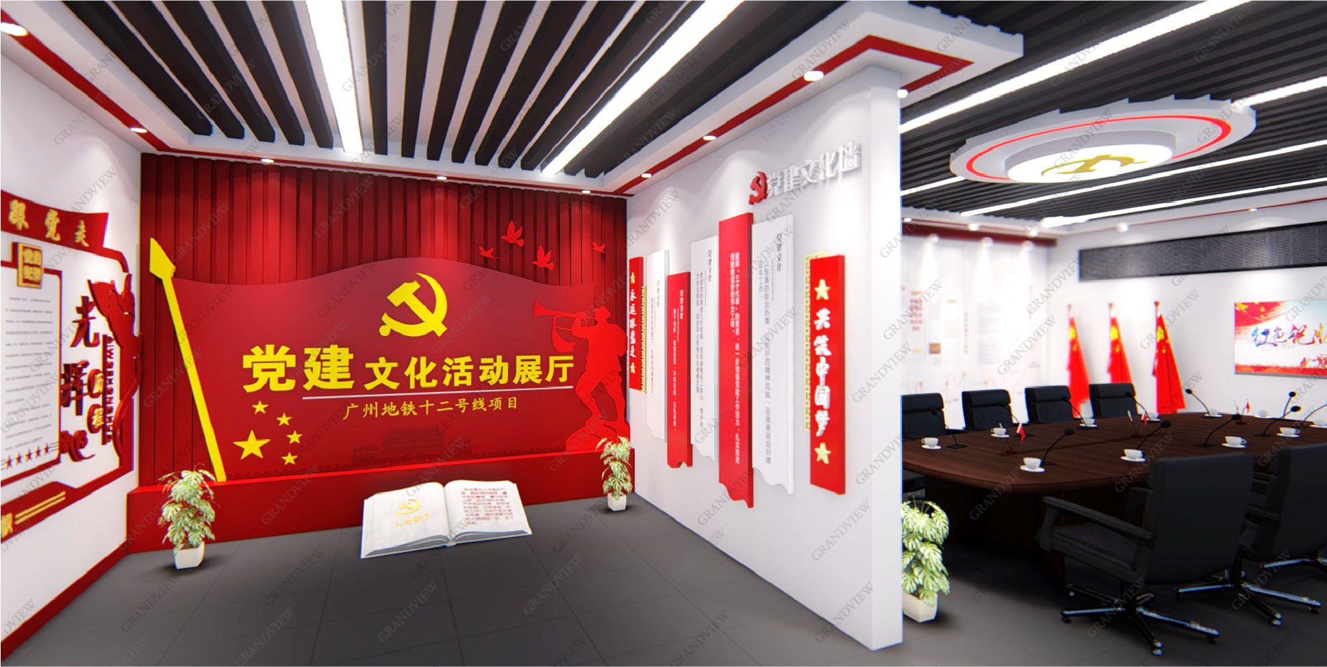 對外,可展示黨的歷程和發展故事,學習黨的精神,感受黨的莊嚴和神圣;對內,可進行黨建會議的召開,促進廣州地鐵十二號線的高質量發展,防火的搪瓷鋼板元素的采用與地鐵的實際情況相符,大量紅色元素的應用產生強烈的視覺沖擊。