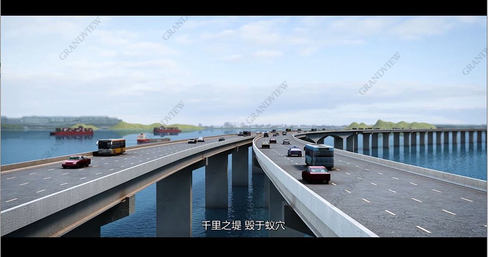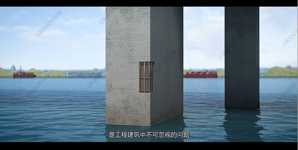 在專題片中,通過三維動畫展示海上橋梁大景,宏觀的交代橋墩身處飛濺區,切開露出的鋼筋展示肉眼看不到的工程細節。