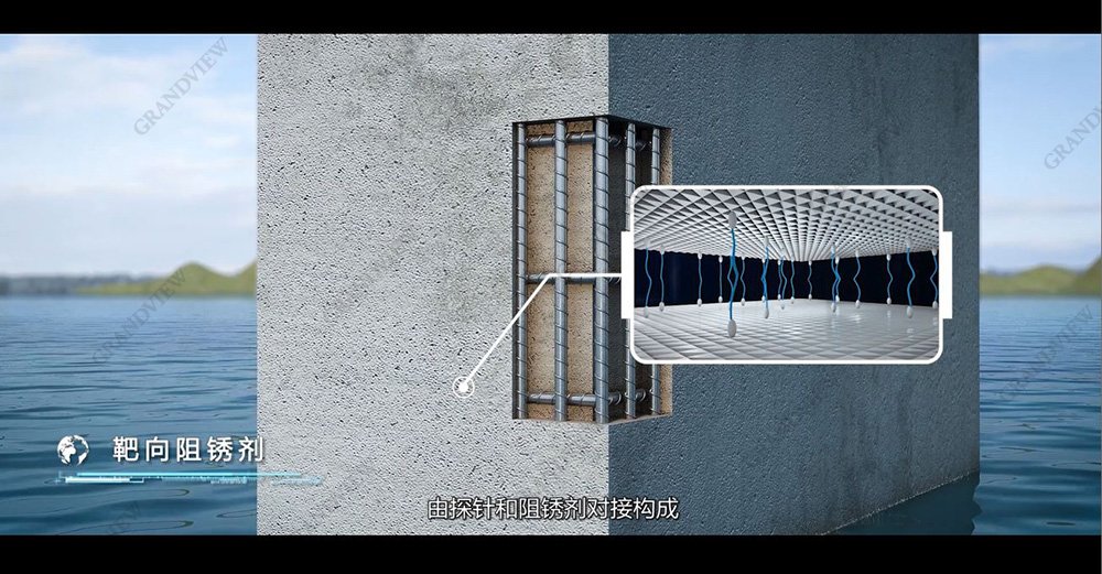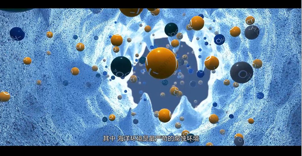 鏡頭再次遞進,進入分子結構層,AE標注畫面清晰。窺探式的鏡頭,通過形象的動畫,將阻銹劑擬人化,探針奮力游向有害元素并結合的過程以動畫展示,真實的質感與色彩,這一切都仿佛有了生命,超敏智能防腐新材料也賦予工程新生命。